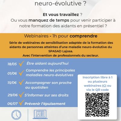 Au programme, 5 modules en ligne entre mai et juillet pour sensibiliser aux maladies neuro-evolutives ( Alzheimer, Parkinson etc..) et acquérir quelques informations concrètes et mieux concilier rôle d'aidant, vie personnelle et parfois vie professionnelle.